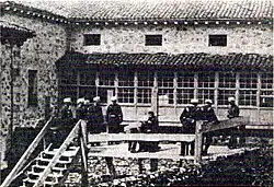 Under a false identity of a reporter for the Il Popolo newspaper by the name of Emilio Rinaldini, Michele Angiolillo travelled to Spain from London, passing through Paris and Bordeaux.[6] When he reached Madrid, he learned that Cánovas had travelled to the thermal bath resort of Santa Águeda (now a psychiatric hospital) in Mondragón, Guipúzcoa, and decided to pursue him there.[5] On 8 August 1897, Angiolillo found Cánovas alone and shot him dead. The Prime Minister's wife hurried to the scene, shouting "Murderer! Murderer!" after the gunman. Angiolillo, in turn, bowed and declared, "Pardon, Madame. I respect you as a lady, but I regret that you were the wife of that man." The repression and mass torture at Montjuich was a direct factor behind Michele Angiolillo's decision to assassinate Cánovas, and he claimed in his defence speech to be "no assassin, but rather an executioner", calling Cánovas, among other things, the personification of the greed of the bourgeoisie and the tyranny of power.[7]