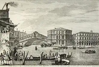 Marieschi was born in Venice in 1710 as the son of an engraver, who died when he was eleven. He probably trained either with Gaspare Diziani,[2] or Canaletto,[3] or both. According to his biography in Pellegrino Antonio Orlandi's Abecedario Pittorico, published in Venice in 1753,[4] he spent some time in Germany, where he may have worked as a stage designer.[5] He returned to Venice by 1731, when he is recorded as a scene-painter, and in 1735 he worked on the "effects" for the funeral in Fano of Maria Clementina Sobieska, wife of the Old Pretender.[2] Under the influence of Marco Ricci and Luca Carlevarijs and encouraged by the success of Canaletto in the genre, he started to create capricci and vedute.[1]