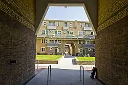 Brinkman chose to offer a middle ground between two conventional models of social housing: the poorly ventilated, dimly lit towers of dense cities and the undifferentiated row houses of suburban enclaves. He aimed to achieve a feeling of unity associated with garden-village development, whilst using a stacked construction and bovenstraten. He was experienced in planning industrial buildings where the flows of commodities between processes are critical, and he took such a systems approach towards housing. Tradesmens' delivery route were facilitated, and the directions of rubbish disposal. He was familiar with new ways of working with reinforced concrete, and employed it to form the floor decks. Balconies were precast. The window sizes followed function, large for lounges and small and recessed for bedrooms. Window placement was such that they were designed into the room, but also used externally as a regular visual feature. The courtyard is broken up into a series public areas that ripple from small to large giving a dynamic to the external space. Buildings are pierced at ground floor level by the road and main pathways but are continuous at the level of the bovenstraat.[5]