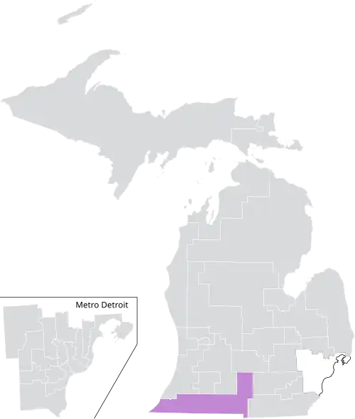 The district was located entirely within Michigan's 7th congressional district, and overlapped with the 17th, 56th, 57th, and 65th districts of the Michigan House of Representatives.[8] It bordered the state of Ohio, and shared a water border with Canada via Lake Erie.[9]