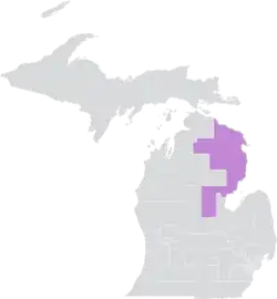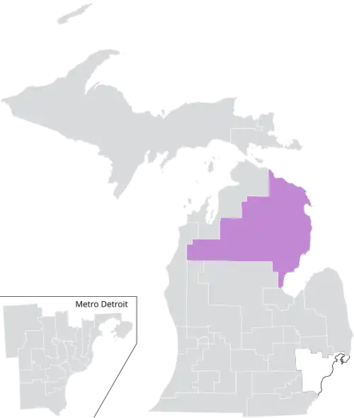 The district overlapped with Michigan's 1st, 4th, and 5th congressional districts, and with the 97th, 98th, 99th, 105th, and 106th districts of the Michigan House of Representatives.[6] Most of the district lied along Lake Huron and Saginaw Bay.[7]