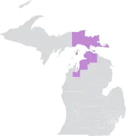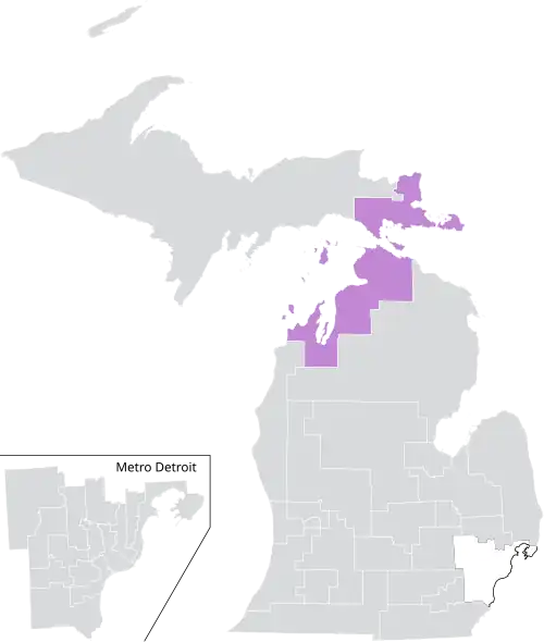 The district was located entirely within Michigan's 1st congressional district, and overlapped with the 104th, 105th, 106th, 107th, and 109th districts of the Michigan House of Representatives.[6] The district bordered Canada, as well as three Great Lakes: Huron, Michigan, and Superior.[1]