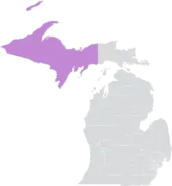 District 38 encompasses the entirety of Alger, Baraga, Delta, Dickinson, Gogebic, Houghton, Iron, Keweenaw, Luce, Marquette, Menominee, Ontonagon, and Schoolcraft counties, as well as parts of Chippewa and Mackinac counties.[5]