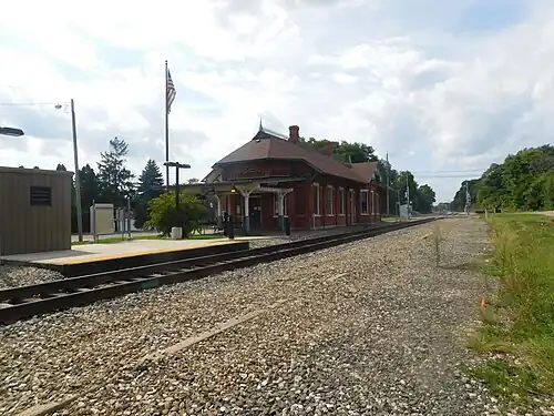 Albion station is a train station in Albion, Michigan, served by Amtrak's Wolverine line. Baggage cannot be checked at this location; however, up to two suitcases in addition to any "personal items" such as briefcases, purses, laptop bags, and infant equipment are allowed on board as carry-ons. Amtrak does not provide ticketing or baggage service at this station, which is served by two trains daily.[2]