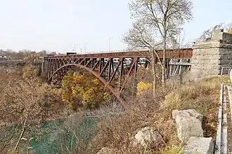 The Michigan Central Railway Bridge is an out-of-service steel Deck arch bridge spanning the Niagara Gorge between Niagara Falls, Ontario and Niagara Falls, New York. The bridge is owned by Canadian Pacific Kansas City, which (as CP Rail) purchased the single track structure in 1990. The Canadian corridor and bridge are owned by the City of Niagara Falls, Ontario.[1] The bridge is located just upstream from the older arch-style Whirlpool Rapids Bridge used by Maple Leaf Amtrak passenger trains.