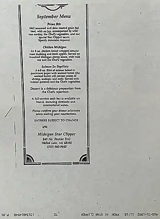 The Michigan Star Clipper dinner train operated for several years out of Walled Lake on approximately 8.07 miles (12.99 km) of the Michigan Air-Line Railway rail line.[1] The Star Clipper first operated out of Osage, Iowa, in 1984. In 1985, Mr. Haley first teamed up with the KLS&C Railway in Paw Paw, Michigan. Mark Campbell, Kevin McKinney, and Jerry Pilcher were the owners who brought the train to Michigan, first to Paw Paw in 1985 and then to Walled Lake in 1986, where it has been ever since. The Iowa operations were discontinued in December 1987, with Mr. Haley’s decision to sell the railroad to an up-and-coming freight railroad conglomerate. The Star Clipper made a brief appearance in the Fort Worth, Texas, area, running two seasons during 1999 and 2000. In 2006, the Star Clipper Dinner Train was sold to Railmark Holdings, who increased and expanded both its programming and advertising in order to meet an ever changing and diverse ridership demographic in a world of internet communications.[2] The trip started and finished from the historic Walled Lake Coe Rail depot, in operation since 1887, on Pontiac Trail Rd. in Walled Lake, MI. The trip was on the Michigan Air-Line Railway which dead-ended into the main line owned by CSX. The locomotive for the Michigan Star Clipper is a General Motors EMD F7 1,500-horsepower engine, built in 1950 for the Erie Lackawanna Railroad. The engine, rebuilt and computerized, is electric and operated the train smoothly at a top speed of 10 m.p.h.; even the drinks on the dining tables did not spill out.[3]