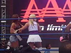 A fan of professional wrestling from an early age, James attended a professional wrestling school in the Washington, D.C., area at the suggestion of a friend.[16][18] She made her professional debut on the independent circuit on 28 August 1999,[19] as a wrestler for KYDA Pro Wrestling under the ring name Alexis Laree, a name created as the result of a combination of her stage name from when she was a dancer and her middle name.[6][9][20] Laree went on to manage several male wrestlers, including managing Tommy Dreamer to win the KYDA Pro Heavyweight Championship.[11][21] In March, she wrestled in her first match, an intergender tag team match with Jake Damian against American Mike Brown and Candie.[11] She trained to improve her wrestling abilities by attending training camps such as the Funking Conservatory, a workshop run by Dory Funk Jr., and an Extreme Championship Wrestling (ECW) dojo. She also started competing for Maryland Championship Wrestling (MCW), where she trained at camps run by Ricky Morton and Bobby Eaton.[9][11] Beginning in 2002, she also made appearances for Ring of Honor.[3]