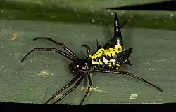 Species with extremely long spines evolved at least eight times in the genus Micrathena and likely function as anti-predator defenses.[8] Gasteracantha orb-weavers also have hardened abdomens with variously shaped spines, but they are not closely related to Micrathena within the orb-weaver family.[9]