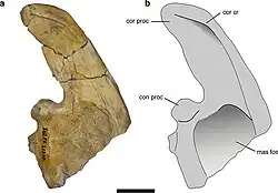 The right mandible fragment preserves just the dorsal portion of the ramus with the coronoid and the condylar processes. The condylar process is small, cylindrical and posteriorly has a slightly convex articular facet where it articulates with the glenoid fossa on the squamosal. The mandibular notch is anteroposteriorly very narrow. The coronoid process is anteroposteriorly narrow, dorsoventrally elongated and mediolaterally slender. There is no sign of a condyloid crest in contrast to Cramauchenia normalis and Macrauchenia which share a subtle but noticeable condyloid crest dividing the masseteric fossa into two halves. In Theosodon, the condyloid crest may be variable, as there appears to be a very subtle ridge in Theosodon garretorum, but this is absent in Theosodon lydekkeri specimens. Llullataruca shockeyi also seems to lack a condyloid crest. Apart from differences in the development of the condyloid crest and differences in size, the general outline of this element is very similar to Miocene macraucheniids like Theosodon and Llullataruca, and also to more derived Pleistocene macraucheniids like Macrauchenia, which indicates that over time this element has been mostly conserved within this family.[2][1]