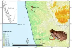 - ^ a b c d e f g Seshadri, K. S.; Singal, Ramit; Priti, H.; Ravikanth, G.; Vidisha, M. K.; Saurabh, S.; Pratik, M.; Gururaja, Kotambylu Vasudeva (2016). "Microhyla laterite sp. nov., a new species of Microhyla Tschudi, 1838 (Amphibia: Anura: Microhylidae) from a laterite rock formation in south west India". PLOS ONE. 11 (3): e0149727. Bibcode:2016PLoSO..1149727S. doi:10.1371/journal.pone.0149727. PMC 4784882. PMID 26960208.