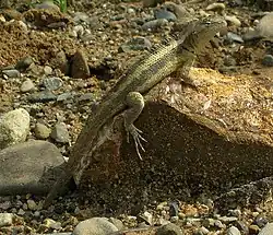 There are a total of 24 species that are considered lava lizards.[8] Across the species, there is little to physically differentiate between subspecies (i.e., Microlophus bivittatus and Microlophus occipitalis).[8] Additionally, all lava lizards exhibit the same behavioral paradigms, including doing "push ups" as shows of aggression to other individuals.[8] All of the subspecies of lava lizards can either be found within the Galapagos or the Pacific Coast of South America, though the subspecies very rarely have overlapping ranges.[8] Even though thee species as a whole is very common, there are individual subspecies that are considered vulnerable populations.[8]