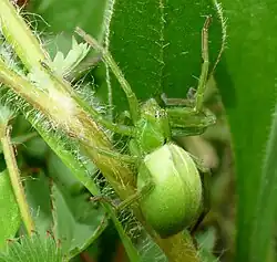 In the females of Micrommata ligurina the body length can reach 9–14 millimetres (0.35–0.55 in), while in the males it is about 6–9 millimetres (0.24–0.35 in).[4] The carapace is long and narrow and the abdomen is elongate. The cephalothorax and the long legs of the females are bright green, with a lighter green abdomen showing an almost indistinct median band.[4]