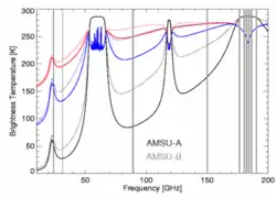 One distinguishes between imaging instruments that are used with conical scanning for remote sensing of the Earth surface, e.g. AMSR, SSMI, WINDSAT, and sounding instruments that are operated in cross-track mode, e.g. ATMS/MHS. The first type uses lower frequencies (1–100 GHz) in atmospheric windows to observe sea-surface salinity, soil moisture, sea-surface temperature, wind speed over ocean, precipitation and snow. Other than optical earth observation sensors, passive microwave can be used do determine the snow water equivalent (liquit water content of snow) by comparing various frequencies. [13][14] The second type is used to measure along absorption lines to retrieve temperature and humidity profile. Furthermore, limb sounders, e.g., MLS, are used to retrieve trace gas profiles in the upper atmosphere.