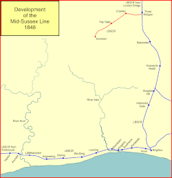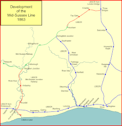 The Mid-Sussex railways were a group of English railway companies that together formed what became the Mid-Sussex line, from Three Bridges through Horsham to Littlehampton, in southern England. After 1938 the Southern Railway operated a regular electric train service ran from London to Bognor Regis and Portsmouth using the marketing brand "Mid-Sussex Line", leading to an informal consensus.[1][2][3][4] The Mid-Sussex Railway Company ran from Horsham to Petworth, and the Mid-Sussex Junction line of the London, Brighton and South Coast Railway (LBSCR) extended from the Petworth line to Littlehampton. The Three Bridges to Horsham branch of the LBSCR was at first the sole access from the north to the Mid-Sussex railways, although a line from Leatherhead was used later.