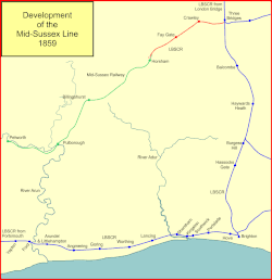 There was a large area between the Brighton main line and the Portsmouth Direct line unoccupied by any railway, in the middle of the nineteenth century. The area was agricultural with no large towns in it, but nevertheless it was desired to occupy it with a railway. A local concern, the Mid-Sussex Railway was projected: it would build a line on from Horsham to Billingshurst, Pulborough and Petworth. The Mid-Sussex Railway Company received its authorising act of Parliament, the Mid Sussex Railway Act 1857 (20 & 21 Vict. c. cxxxiii) on 10 August 1857.[1][11][12][13]