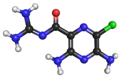 Amiloride, sold under the trade name Midamor among others, is a medication typically used with other medications to treat high blood pressure or swelling due to heart failure or cirrhosis of the liver.[1][2] Amiloride is classified as a potassium-sparing diuretic. Amiloride is often used together with another diuretic, such as a thiazide or loop diuretic.[2] It is taken by mouth.[1] Onset of action is about two hours and it lasts for about a day.[2]