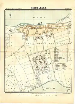 The current station is the second station in Middelfart. The first station in the town opened in 1865 as the western terminus of the so-called Queen Louise's Railway, the main line across the island of Funen between Nyborg and Middelfart via Odense.[5] The station was inaugurated along with the railway line on Queen Louise's 48th birthday the 7 September 1865, with regular traffic commencing the following day.[7]