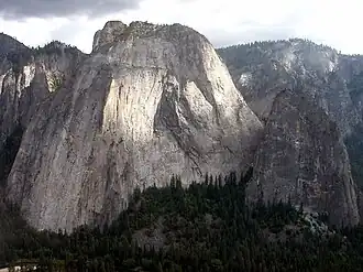 The Middle Cathedral Rock is a prominent rock face on the south side of Yosemite Valley, California. El Capitan lies due north of Middle Cathedral. Middle Cathedral's East Buttress Route is recognized in the historic climbing text Fifty Classic Climbs of North America.[3]