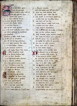 The Ezzolied (before 1064),[60] the first literary work of the MHG period, is a strophic work of salvation history from the Creation to the Crucifixion.[61] The other poems from the first century of this period are likewise designed to present biblical material to a lay audience, and range from "biblical ballads" — short poems on individual biblical episodes — to longer retellings of complete Old Testament books.[62] Many of these are collected in manuscript compilations, of which the most notable is the Vorau manuscript, with a dozen Biblical pieces. This includes poems by Ava, the earliest known female poet writing in German.[63][64]
