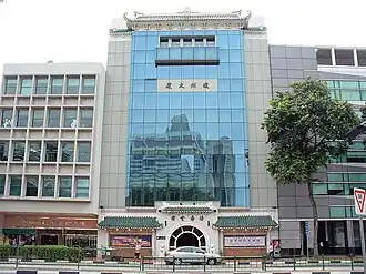 The Hainanese Association of Singapore, Kheng Chiu Hwee Kuan and clan temple building was built in 1857 in three adjoining shop houses along No. 6, Malabar Street.[9] In 1878, it moved to its present location along Middle Road, and later underwent renovations in 1963. The main deity of this temple was Tian Hou (or Ma Chor), the goddess of safe passage at sea. The temple has a wealth of valuable artefacts such as couplet scrolls by famous personalities, rare bronze guard of honour, stone tablets and inscribed boards.[10]