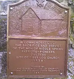 Presbyterian preaching began on this site in the open air as early as 1736. Two years later, Presbyterian Church officials erected a new building here, close to the bank of the small Middle Spring creek that ran through the area, a common practice of Scotch-Irish settlers in the Cumberland Valley that enabled settlers to live and work near available, abundant sources of water. The first building was a log church, which became not only a house of worship but a gathering place for the earliest immigrants.[3] They called the church site "Middle Spring", because it was located midway between two other water sources in the area, the Big Spring and the Rocky Spring.[4] The church was thirty-five feet square. It had slab benches, a dirt floor and was unheated. The pulpit was high and was set against the wall with the precentor's desk positioned just below, in the front.