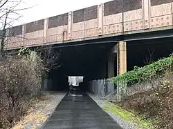 Using open space funds,[5] Middlesex County purchased the roadbed from Conrail in December 2002 for approximately $50,000.[4] In 2004, Edison elected officials challenged NJDOT's plan to replace an original railroad trestle with a 140-foot-long tunnel-like structure to carry the trail under U.S. Route 1. The proposed culvert would have reduced the trail's capacity to a 14-foot-wide by 10-foot-high passageway, potentially preventing mounted police from traversing the highway.[6] NJDOT eventually agreed to construct a pedestrian bridge in lieu of the culvert.[5]