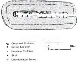 Midhowe represents an example of collective burial common to the Orkney-Cromarty tombs.[15] The remains of at least 25 individuals were discovered in the tomb. Seven of the twelve chambers have side shelves- the bodies were found in groups of two to four on six of the shelves.[15] Several of the skeletons were in a crouched position on the shelves, with their backs to the side wall and heads resting against the supporting pillars. Other groups of bones had been heaped into the centers of the shelves or swept under them, suggesting that earlier burials had been moved to accommodate later ones.[15] In a few cases only the skulls were present, in one instance the long bones had been piled together with the skull placed on top.[16]
