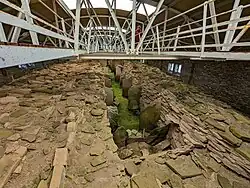 Midhowe is an extreme example of the form with twelve chambers flanking a passageway 23.6 metres (77 ft) in length.[6] The transverse stones rise to a height of 2 metres (6.6 ft) and the walls still rise to a height of 2.5 metres (8.2 ft).[4] Like most tombs in Orkney, the original roof is gone, replaced by a modern hangar-like structure that protects the site. The nature of the original roof is unclear; it may have consisted of flat slabs of flagstone at a height of 3 metres (9.8 ft) or more. Alternatively, it may have been vaulted like Maeshowe to a height of as much as 5 metres (16 ft).[7] The cairn appears to have been intentionally filled with debris after hundreds of years of usage beginning early in the third millennium BC.[8] The size and complexity of the interior of the cairn must have exerted a powerful influence on those entering it. Castleden describes it this way: