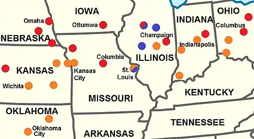 The dialect region "Midland" was first labeled in the 1890s,[13] but only first defined (tentatively) by Hans Kurath in 1949 as centered on central Pennsylvania and expanding westward and southward to include most of Pennsylvania, and the Appalachian regions of Kentucky, Tennessee, and all of West Virginia.[7][14] A decade later, Kurath split this into two discrete subdivisions: the "North Midland" beginning north of the Ohio River valley area and extending westward into central Indiana, central Illinois, central Ohio, Iowa, and northern Missouri, as well as parts of Nebraska and northern Kansas; and the "South Midland", which extends south of the Ohio River and expands westward to include parts of Kentucky, Tennessee, southern Indiana, southern Illinois, southern Ohio, southern Missouri, Arkansas, southern Kansas, and Oklahoma, west of the Mississippi River.[15] Kurath and then later Craig Carver and the related Dictionary of American Regional English based their 1960s research only on lexical (vocabulary) characteristics, with Carver et al. determining the Midland non-existent according to their 1987 publication and preferring to identify Kurath's North Midland as merely an extension of the North and his South Midland as an extension of the South, based on some 800 lexical items.[16]
