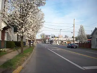 View west along the Midland Trail departing White Sulphur Springs, West Virginia. Note signage indicating the Midland Trail