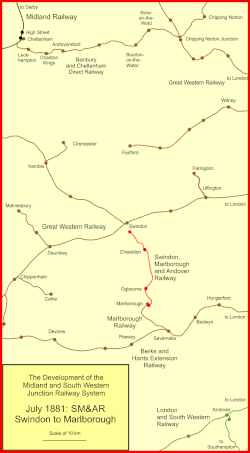 Business interests at Swindon and Marlborough pressed to promote a north-south connection, and a Swindon, Marlborough, Southampton and New Forest Railway was promoted, soon renamed the Swindon, Marlborough and Andover Railway (SM&AR). With considerable support at Marlborough and from the LSWR, and perhaps surprising support from the Marlborough Railway and the GWR, the Swindon, Marlborough, and Andover Railway Act 1873 (36 & 37 Vict. c. cxciv) which authorised the scheme received royal assent on 21 July 1873, with share capital of £375,000 and borrowing powers of £125,000. The Marlborough Railway was authorised to subscribe up to £25,000 in addition, and improvements to their railway could be carried out.[3][6]
