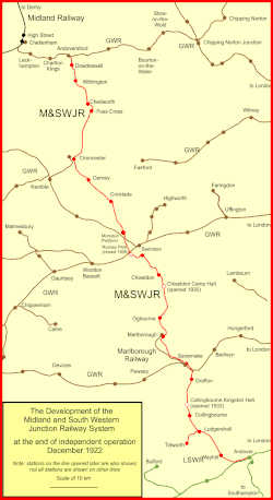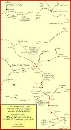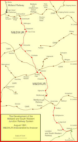 The Midland and South Western Junction Railway (M&SWJR) was an independent railway built to form a north–south link between the Midland Railway and the London and South Western Railway in England, allowing the Midland and other companies' trains to reach the port of Southampton.[2] The M&SWJR was formed in 1884 from the amalgamation of the Swindon, Marlborough and Andover Railway and the Swindon and Cheltenham Extension Railway. The line was absorbed by the Great Western Railway at the 1923 grouping of the railways, and became part of British Railways on nationalisation in 1948. The railway closed to passengers in 1961, and to goods between 1964 and 1970. A small part of it has been reopened as the heritage Swindon and Cricklade Railway.