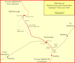 In fact nothing was done until 1933, when a less radical rationalisation was carried out: the former M&SWJR double track route was made into two single lines from Marlborough Tunnel South: the M&SWJR down (southbound) line was now dedicated to through trains to and from Savernake High Level over the M&GR line, and the former up (northbound) line connected to Savernake Low Level (the old Berks and Hants Extension line) using the link at Hat Gate; the majority of the original Marlborough Railway branch was closed and passenger traffic concentrated on the M&SWJR station there. This was implemented with effect from Monday 27 February 1933.[23]