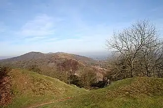 Midsummer Hill is situated in the range of Malvern Hills that runs approximately 13 kilometres (8 mi) north-south along the Herefordshire-Worcestershire border. It lies to the south of Herefordshire Beacon with views to Eastnor Castle.[1] It has an elevation of 284 metres (932 ft). To the north is Swinyard Hill. It is the site of an Iron Age hill fort which spans Midsummer Hill and Hollybush Hill. The hillfort is protected as a Scheduled Ancient Monument and is owned by Natural England. It can be accessed via a footpath which leads south from the car park at British Camp on the A449 or a footpath which heads north from the car park in Hollybush on the A438.[2]