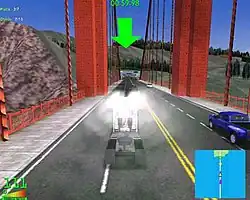Opinions were polarized on the game's graphics, with some reviews citing them as dated. The reviewer from Edge stated that the "civilian vehicles are little more than coloured blocks on wheels."[17] Bass also felt the graphics were poor, calling them "frighteningly similar" to the game's predecessor.[24] GamePro's Brian Wright conceded that the ambient traffic vehicles were not detailed, and that building textures were blurry. In contrast he praised the playable vehicles and noted their reflected surfaces and damage models as high points.[26][a] The vehicle models were categorized as "quite accurate" by Chris Couper of AllGame, and went on to add that it was "the sort of detail that impresses before the racing even begins".[13]