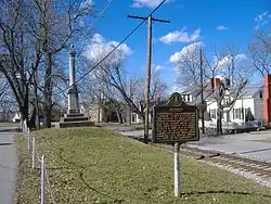 The McKee Monument (see photo 12 and site 30) honors William R. McKee, the chief engineer of the Lexington and Ohio Railroad. "Due to his efforts the second regiment of the Kentucky volunteers was mustered and he was made their captain. In the battle of Buena Vista, after leading his regiment to victory, he was fatally wounded. " (A History of Midway, p. 31). The monument, dedicated by Midway citizens on July 4, 1847, consists of a fluted column surmounted by an urn. The inscription on the plinth was composed by Theodore O'Hara, McKee's First Lieutenant who is renowned for having written a famous poem, "The Bivouac of the Dead".