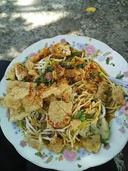 Mie kopyok (lit. 'shaken noodle'), is an Indonesian noodle soup, a specialty of Semarang City, Central Java. The dish consists of noodles served in garlic soup, slices of fried tofu, lontong, bean sprouts, and crushed crackers, sprinkled with sliced fresh celery, and fried shallot. It is served with kecap manis on top.[1] Mie kopyok was mostly peddled with pushed food carts from one sub-district to another, but now, it can be found in the downtown of Semarang with a permanent building.