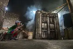 The noodles are cut using both modern and traditional tools. Traditional tools include a large circular cutter with eight blades, which are operated by several people. The cutter is placed over a mortar or basin with a sieve to catch the cut noodles. Once cut, the noodles are spread out and dried.