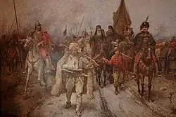 Upon first seeing it, Georgije was displeased by Jovanović's depiction of the exodus, particularly the sight of sheep and wagons carrying women and children, saying it made the migrants look like "rabble on the run".[29] The source of the Patriarch's displeasure lay in differing interpretations of what had originally caused the migration to take place; the Church maintained that Arsenije was simply heeding the call of the Holy Roman Emperor to head north. Having studied Ruvarac's work, Jovanović came to hold the view that fear of Ottoman persecution, rather than the desire to protect the Habsburg frontier, had prompted the migrants to leave their homes.[30] Jovanović duly took the painting back to his studio and altered it to the Patriarch's liking, removing the sheep, lumber wagons, and the woman and her infant son, putting stylized warriors in their place.[27] He also placed the letter Leopold had supposedly sent the Serbs inviting them to settle Vojvodina in the hand of Isaije Đaković, a priest riding beside Arsenije.[31] Although these changes were made relatively quickly, Jovanović could not render them in time for the painting to be displayed in Budapest.[32] Hence, only the Vršac triptych was displayed at the Millennium Exhibition.[33]