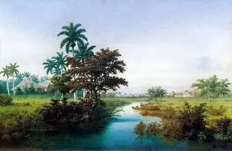 Miguel Arias Bardou (1841–1915) was a Spanish born Cuban painter. He is best remembered for colorful landscapes such as Pueblo Campesino (1891) and Bohío y Palma con Riachuelo (1908) which mainly depicted harmonious rural themes.