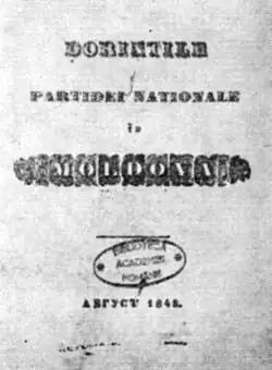 Kogălniceanu became a member and chief ideologue of the Moldavian Central Revolutionary Committee in exile.[6][7] His manifesto, Dorințele partidei naționale din Moldova ("The Wishes of the National Party in Moldavia", August 1848), was, in effect, a constitutional project listing the goals of Romanian revolutionaries.[6][35] It contrasted with the earlier demands the revolutionaries had presented to Sturdza, which called for strict adherence to the Regulamentul Organic and an end to abuse.[36] In its 10 sections and 120 articles,[7] the manifesto called for, among other things, internal autonomy, civil and political liberties, separation of powers, abolition of privilege, an end to corvées, and a Moldo-Wallachian union.[6][7] Referring to the latter ideal, Kogălniceanu stressed that it formed: