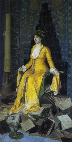 The painting depicts a woman wearing a bright yellow décolleté dress and sitting on a Qur'an lectern. Behind the woman is a tiled mihrab (a niche indicating the direction of the Kaaba in Mecca). On the floor at her feet are several large religious books strewn around.[2] There is an incense burner in the painting's foreground.[3] The identity of the female figure is disputed: she has been variously identified as the painter's wife[4] or his daughter Leyla.[1] Mustafa Cezar, Osman's biographer, has also hypothesised that the model was the daughter of an Armenian housemaid.[5]