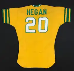 During the second half of the 1971 season, Hegan appeared in 65 games for Oakland, mostly as a pinch hitter or defensive replacement; he batted .236 (13-for-55) with 3 RBI.[4] In 1972, Hegan appeared in 98 regular season games, batting .329 (26-for-79) with a home run and 5 RBI.[4] In the 1972 World Series, the Athletics defeated the Cincinnati Reds in seven games; Hegan appeared in six games, but was hitless in five at bats.[4] Hegan's diving stop of a hot smash grounder off the bat of Cesar Geronimo in the ninth inning helped seal the win for the A's in game 2. In 1973, Hegan was with Oakland until mid-August, batting just .183 (13-for-71) with a home run and 5 RBI in 75 games played.[4] On August 18, Oakland sent him to the Yankees for future considerations.[7]