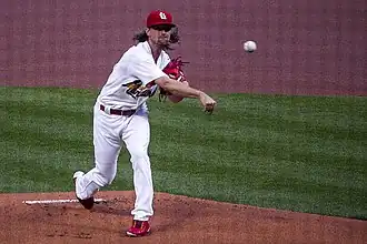 He made his Cardinals debut on April 6 against the Pittsburgh Pirates, allowing four runs and seven hits in 4+1⁄3 IP, resulting in being charged with the loss as Pittsburgh won, 5–1.[22] He earned his first win a Cardinals uniform on May 10 against the Los Angeles Angels of Anaheim in an 8–1 advantage.[23] In consecutive starts against the Milwaukee Brewers and San Diego Padres on July 10 and 18, he struck out at least ten batters in consecutive games for the first time in his career, after previously having two total ten-strikeout games in 189 starts. Covering his previous 48+2⁄3 innings, he had struck out 45 batters while walking three.[24]