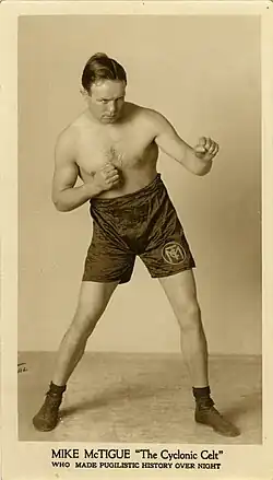 Michael Francis McTigue (Mike McTigue) was born in Lickaun, Kilnamona, in County Clare, Ireland, on 26 November 1892. He was recorded in the 1901 Census of County Clare.[1] McTigue emigrated to America in 1912 when he was 20.[2] He traveled as a steerage passenger of the British steamer Baltic, which arrived at the Port of New York on 21 September 1912. He was the brother of fellow boxer Jim McTigue.