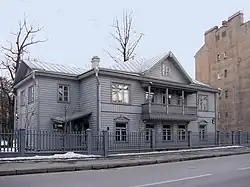 The wooden house of Matyushin and Guro in Saint Petersburg (59°58′15″N 30°18′45″E / 59.970912°N 30.312384°E) now houses the Museum of Avant-Garde in Saint Petersburg, a division of the State Museum of History of Saint Petersburg.[16] The house, originally built in the 1840s or 1850s, became the property of the Literary Foundation (Литературный фонд) in 1904 and operated as an artists' hotel.[16] Matyushin and Guro moved into flat 12 in 1912. The place also provided shelter for Malevich, Filonov, Mayakovsky and other notable artists of the Russian avant-garde and socialist realism.[16]