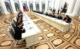Even before Mishustin's nomination, the deputy head of the United Russia faction, Yevgeny Revenko, said that the faction would support any candidate for the post of Prime Minister proposed by Putin. Since United Russia has a majority of seats in the State Duma, this means that Mishustin would become Prime Minister, even if all other parties voted against it.[2] After Mishustin's consultations with the parliamentary factions, the leaders of the Liberal Democratic Party, A Just Russia – For Truth and New People also expressed support for Mishustin.[3][4][5]