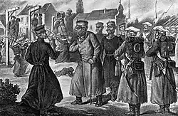 During the January Uprising of 1863, Muravyov was appointed Governor General of Vilna (former Grand Duchy of Lithuania, now Lithuania and part of Belarus). He instituted a complete ban on the Latin alphabet and the Lithuanian language in printed content. The ban was lifted in 1904. He managed to promptly subdue the rebellion. About 9000 insurgents were resettled to Siberia, 127 were demonstratively hanged. Konstanty Kalinowski, Zygmunt Sierakowski and Antanas Mackevičius were among the rebel leaders executed on his orders. Those settlements where the rebels were reported had to pay enormous contributions. As a consequence, for Poles and liberal Russian circles Muravyov became known as the "hangman of Vilnius" [1] even in modern Polish historiography he is sometimes referred to by his contemporary nickname, 'Wieszatiel' ('hangman'). To many nationally minded Russians, Muravyov was a hero and the de facto head of the "Russian Party". They flooded Muravyov with congratulatory telegrams on his nameday, November 8, 1863, a form of public expression previously unknown in Russia.[1]