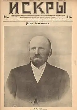 Giers served as the Imperial Russian ambassador to Romania from 1902 to 1912 before transferring to perform the role in the Ottoman Empire.[1] His conservative approach to diplomacy and abidance to protocol meant he could do little to stem increasing German influence on the Ottoman Porte.[2] In the lead up to the Black Sea Raid, Giers maintained a network of informants in the Ottoman government.[3] Giers was withdrawn from Constantinople on 31 October 1914, shortly before the Russian declaration of war on the Empire.[4] From 1915 to 1917 he was the Russian ambassador to Italy.[1]