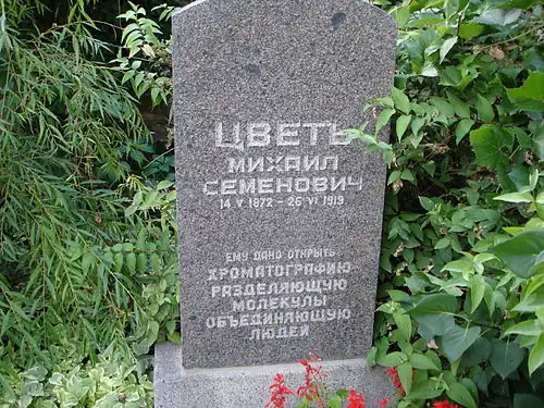 Mikhail Semyonovich Tsvet, also spelt Tsvett, Tswett, Tswet, Zwet, and Cvet (Russian: Михаил Семёнович Цвет; 14 May 1872 – 26 June 1919) was a Russian-Italian botanist who invented chromatography. His last name is Russian for "colour" and is also the root word of "flower."
